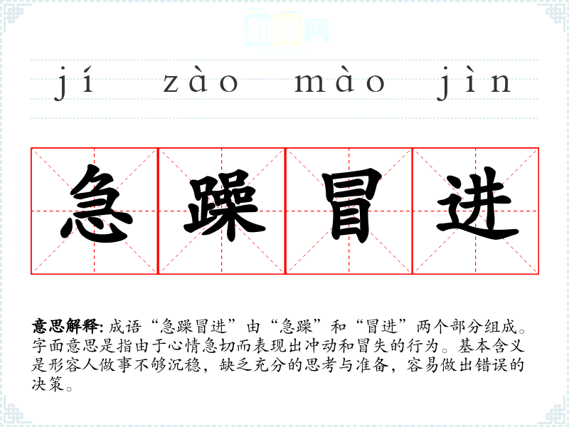 成语“急躁冒进”由“急躁”和“冒进”两个部分组成。字面意思是指由于心情急切而表现出冲动和冒失的行为。基本含义是形容人做事不够沉稳,缺乏充分的思考与准备,容易做出错误的决策。