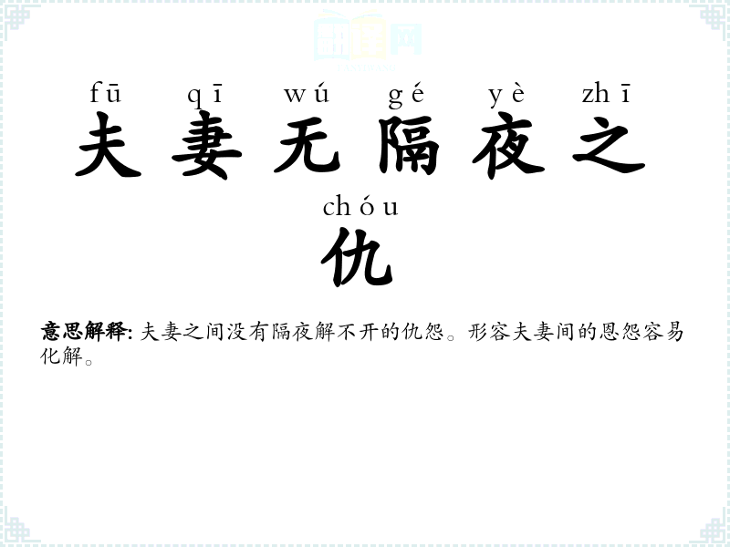 宿:夜。夫妻之间没有隔夜解不开的仇怨。形容夫妻间的恩怨容易化解。 |