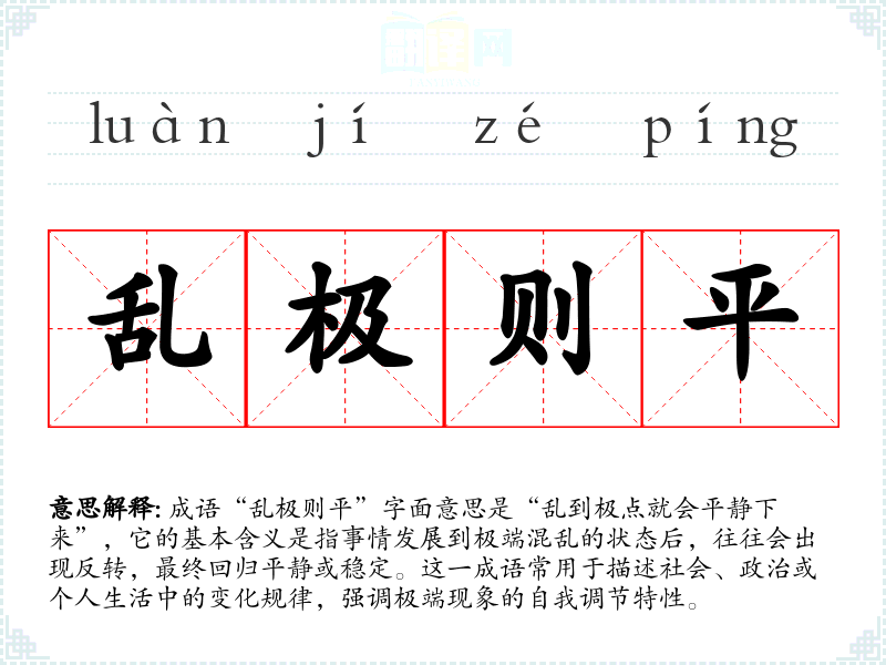成语“乱极则平”字面意思是“乱到极点就会平静下来”,它的基本含义是指事情发展到极端混乱的状态后,往往会出现反转,最终回归平静或稳定。这一成语常用于描述社会、政治或个人生活中的变化规律,强调极端现象的自我调节特性。
