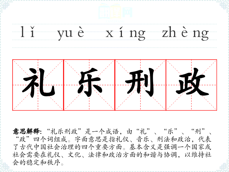 “礼乐刑政”是一个成语,由“礼”、“乐”、“刑”、“政”四个词组成。字面意思是指礼仪、音乐、刑法和政治,代表了古代**社会治理的四个重要方面。基本含义是强调一个国家或社会需要在礼仪、文化、法律和政治方面的和谐与协调,以维持社会的稳定和秩序。