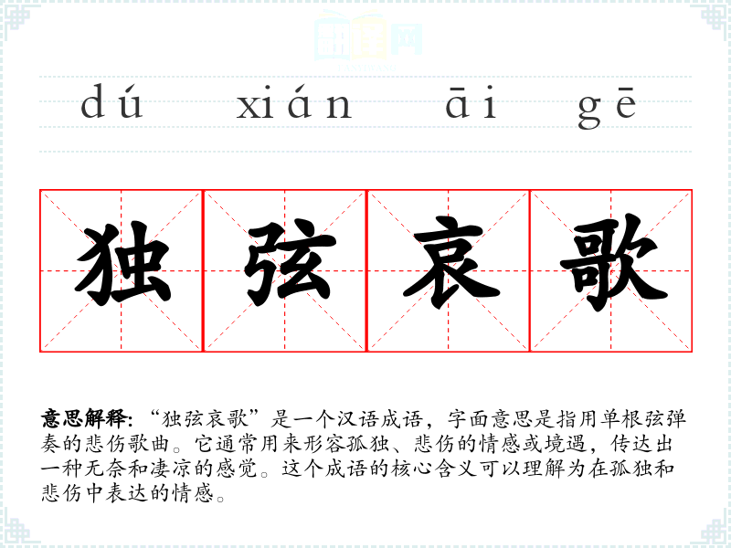 “独弦哀歌”是一个汉语成语,字面意思是指用单根弦弹奏的悲伤歌曲。它通常用来形容孤独、悲伤的情感或境遇,传达出一种无奈和凄凉的感觉。这个成语的核心含义可以理解为在孤独和悲伤中表达的情感。