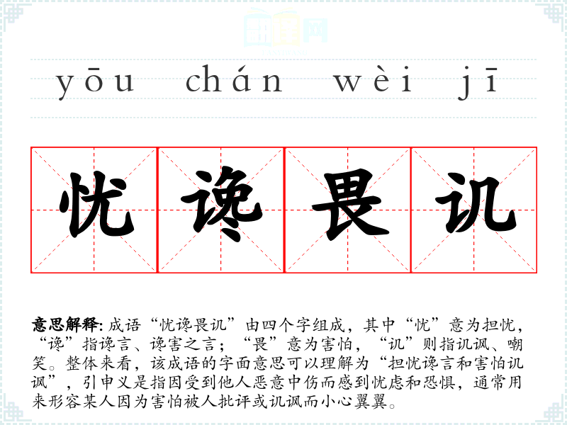 成语“忧谗畏讥”由四个字组成,其中“忧”意为担忧,“谗”指谗言、谗害之言;“畏”意为害怕,“讥”则指讥讽、嘲笑。整体来看,该成语的字面意思可以理解为“担忧谗言和害怕讥讽”,引申义是指因受到他人恶意中伤而感到忧虑和恐惧,通常用来形容某人因为害怕被人批评或讥讽而小心翼翼。