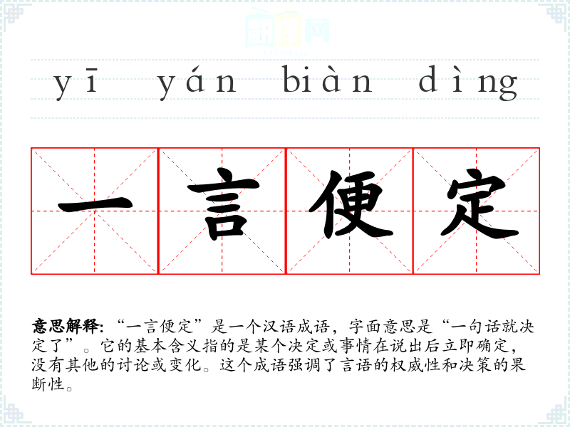 “一言便定”是一个汉语成语,字面意思是“一句话就决定了”。它的基本含义指的是某个决定或事情在说出后立即确定,没有其他的讨论或变化。这个成语强调了言语的权威性和决策的果断性。