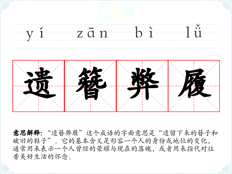 “遗簪弊履”这个成语的字面意思是“遗留下来的簪子和破旧的鞋子”。它的基本含义是形容一个人的身份或地位的变化,通常用来表示一个人曾经的荣耀与现在的落魄,或者用来指代对往昔美好生活的怀念。
