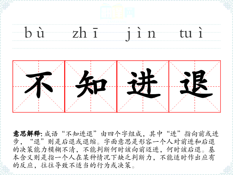 在英语中,类似表达可以是“at a loss”或“unable to make a decision”。这些表达同样反映出对情况的迷茫,但可能缺乏“不知进退”所带有的道德或智慧的评判色彩。