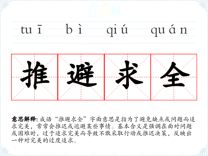 成语“推避求全”字面意思是指为了避免缺点或问题而追求完美,常常会推迟或逃避某些事情。基本含义是强调在面对问题或困难时,过于追求完美而导致不敢采取行动或推迟决策,反映出一种对完美的过度追求。
