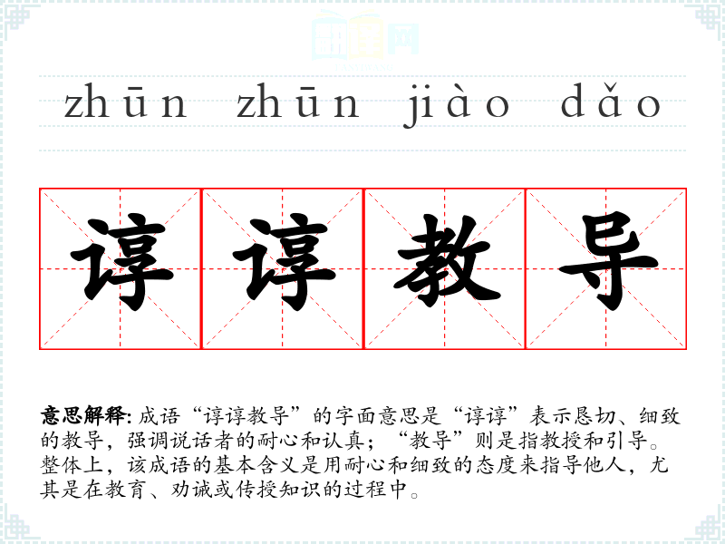 成语“谆谆教导”的字面意思是“谆谆”表示恳切、细致的教导,强调说话者的耐心和认真;“教导”则是指教授和引导。整体上,该成语的基本含义是用耐心和细致的态度来指导他人,尤其是在教育、劝诫或传授知识的过程中。
