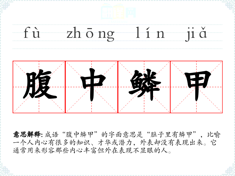 成语“腹中鳞甲”的字面意思是“肚子里有鳞甲”,比喻一个人内心有很多的知识、才华或潜力,外表却没有表现出来。它通常用来形容那些内心丰富但外在表现不显眼的人。