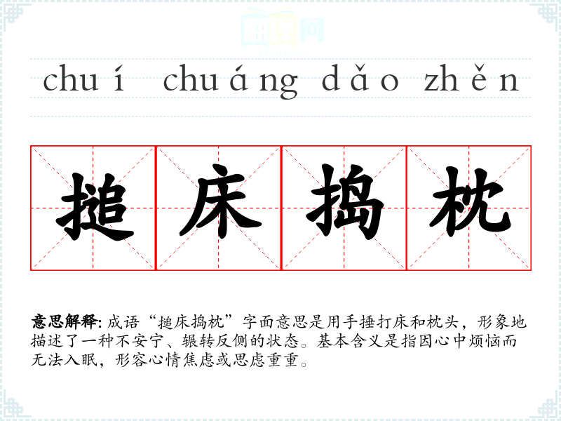 成语“搥床捣枕”字面意思是用手捶打床和枕头,形象地描述了一种不安宁、辗转反侧的状态。基本含义是指因心中烦恼而无法入眠,形容心情焦虑或思虑重重。