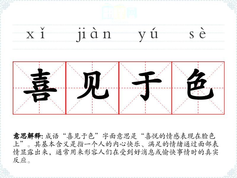 成语“喜见于色”字面意思是“喜悦的情感表现在脸色上”。其基本含义是指一个人的内心快乐、满足的情绪通过面部表情显露出来,通常用来形容人们在受到好消息或愉快事情时的真实反应。