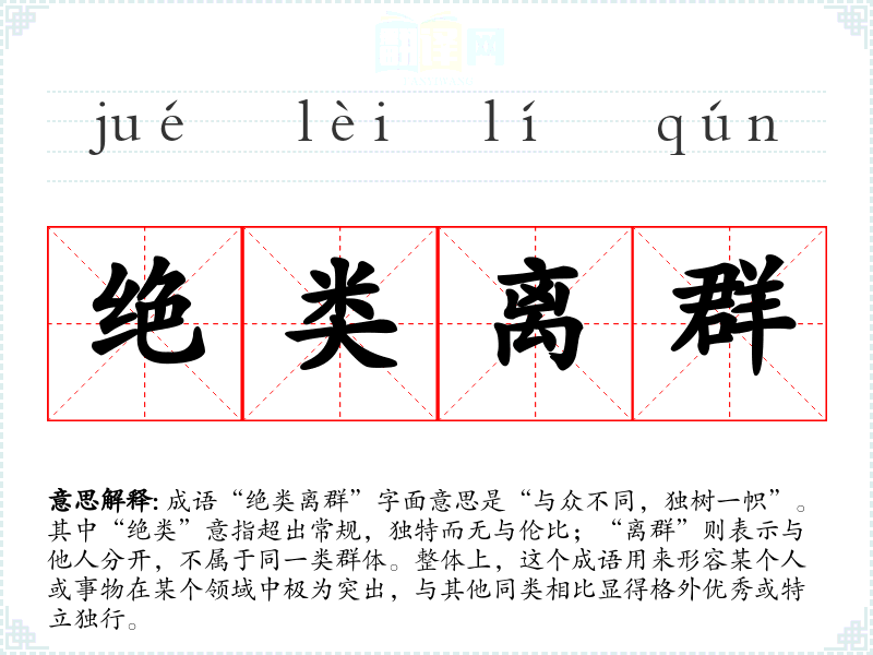 成语“绝类离群”字面意思是“与众不同,独树一帜”。其中“绝类”意指超出常规,独特而无与伦比;“离群”则表示与他人分开,不属于同一类群体。整体上,这个成语用来形容某个人或事物在某个领域中极为突出,与其他同类相比显得格外优秀或特立独行。