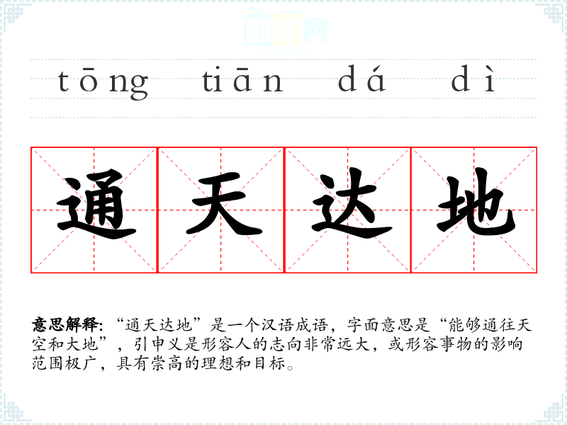 “通天达地”是一个汉语成语,字面意思是“能够通往天空和大地”,引申义是形容人的志向非常远大,或形容事物的影响范围极广,具有崇高的理想和目标。