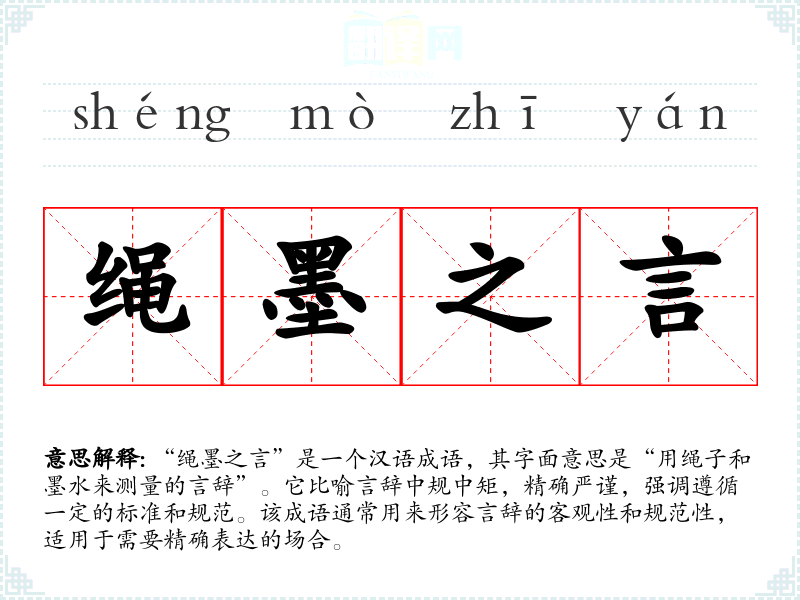 “绳墨之言”是一个汉语成语,其字面意思是“用绳子和墨水来测量的言辞”。它比喻言辞中规中矩,精确严谨,强调遵循一定的标准和规范。该成语通常用来形容言辞的客观性和规范性,适用于需要精确表达的场合。