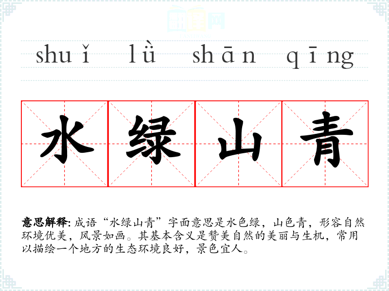 成语“水绿山青”字面意思是水色绿,山色青,形容自然环境优美,风景如画。其基本含义是赞美自然的美丽与生机,常用以描绘一个地方的生态环境良好,景色宜人。