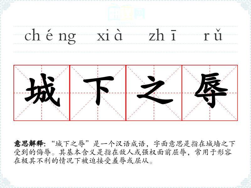 “城下之辱”是一个汉语成语,字面意思是指在城墙之下受到的侮辱。其基本含义是指在敌人或强权面前屈辱,常用于形容在极其不利的情况下被迫接受羞辱或屈从。