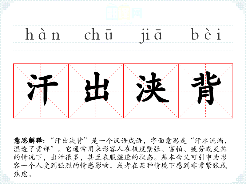 “汗出浃背”是一个汉语成语,字面意思是“汗水流淌,湿透了背部”。它通常用来形容人在极度紧张、害怕、疲劳或炎热的情况下,出汗很多,甚至衣服湿透的状态。基本含义可引申为形容一个人受到强烈的情感影响,或者在某种情境下感到非常紧张或焦虑。