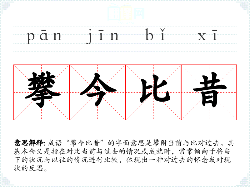 成语“攀今比昔”的字面意思是攀附当前与比对过去。其基本含义是指在对比当前与过去的情况或成就时,常常倾向于将当下的状况与以往的情况进行比较,体现出一种对过去的怀念或对现状的反思。