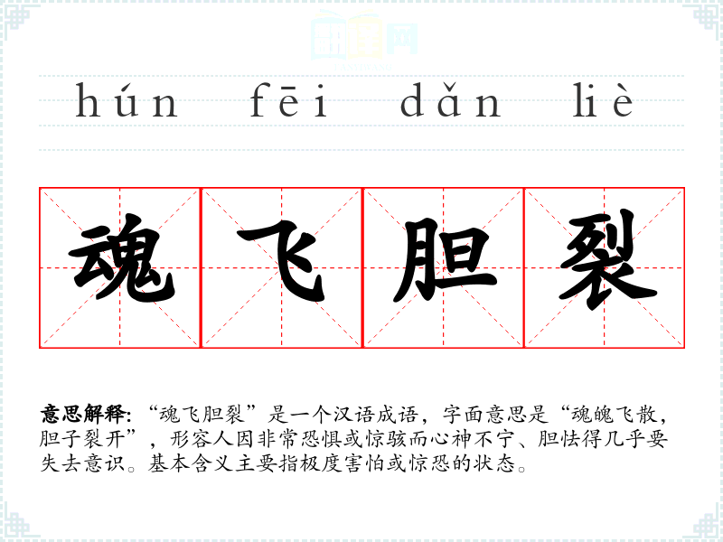 “魂飞胆裂”是一个汉语成语,字面意思是“魂魄飞散,胆子裂开”,形容人因非常恐惧或惊骇而心神不宁、胆怯得几乎要失去意识。基本含义主要指极度害怕或惊恐的状态。