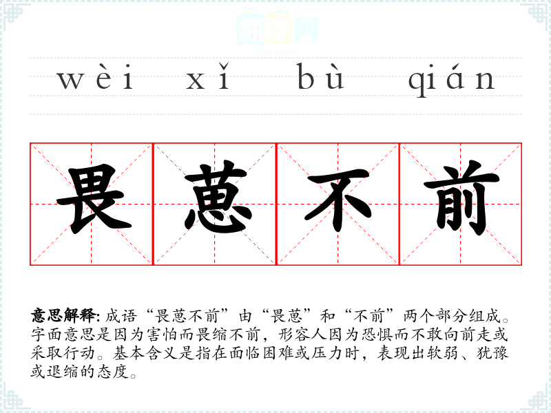 在英语中,与“畏葸不前”相对应的表达可以是“frozen with fear”或“paralyzed by fear”,同样描述因恐惧而无法行动的状态。不同文化中虽然表达方式不同,但所传达的情感和心理状态相似,都反映出面对挑战时的普遍人性。