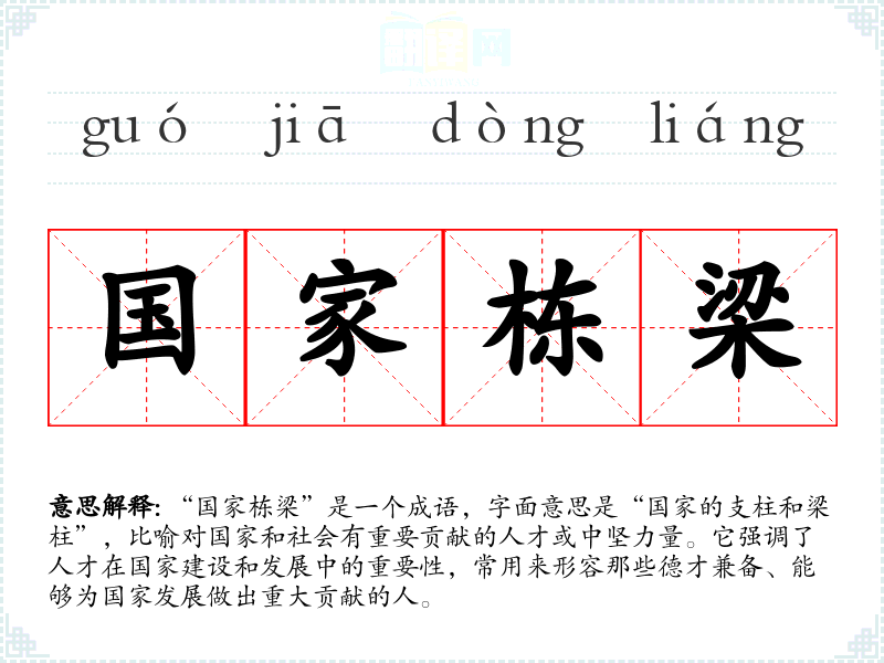 “国家栋梁”是一个成语,字面意思是“国家的支柱和梁柱”,比喻对国家和社会有重要贡献的人才或中坚力量。它强调了人才在国家建设和发展中的重要性,常用来形容那些德才兼备、能够为国家发展做出重大贡献的人。