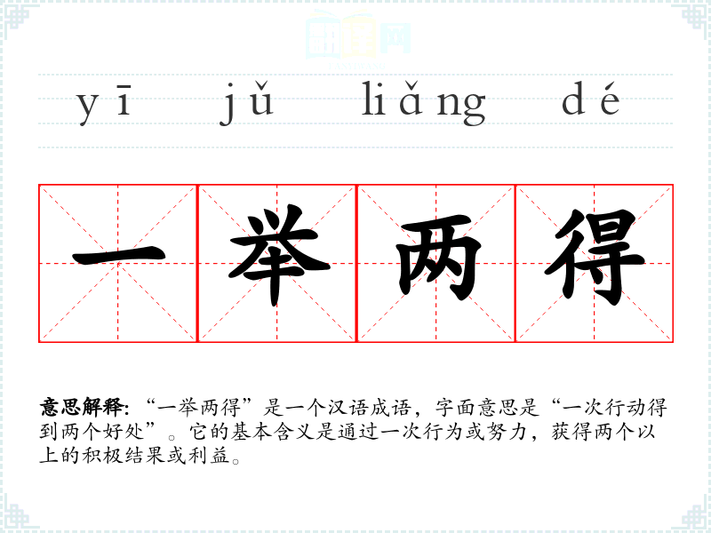 “一举两得”是一个汉语成语,字面意思是“一次行动得到两个好处”。它的基本含义是通过一次行为或努力,获得两个以上的积极结果或利益。