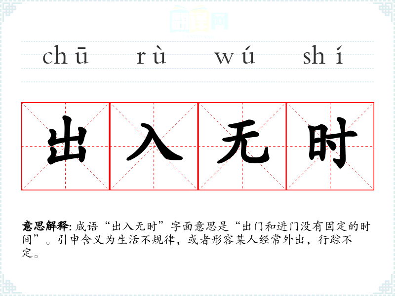 成语“出入无时”字面意思是“出门和进门没有固定的时间”。引申含义为生活不规律,或者形容某人经常外出,行踪不定。
