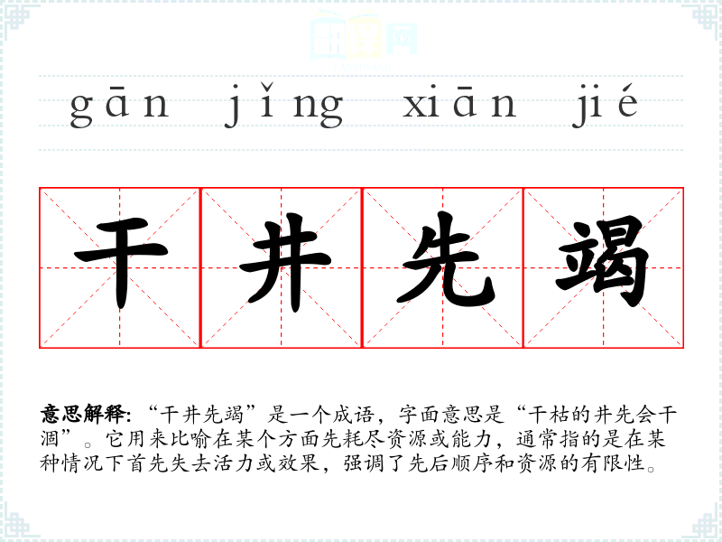 “干井先竭”是一个成语,字面意思是“干枯的井先会干涸”。它用来比喻在某个方面先耗尽资源或能力,通常指的是在某种情况下首先失去活力或效果,强调了先后顺序和资源的有限性。