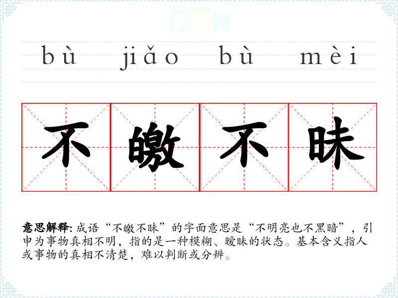 成语“不皦不昧”的字面意思是“不明亮也不黑暗”,引申为事物真相不明,指的是一种模糊、暧昧的状态。基本含义指人或事物的真相不清楚,难以判断或分辨。