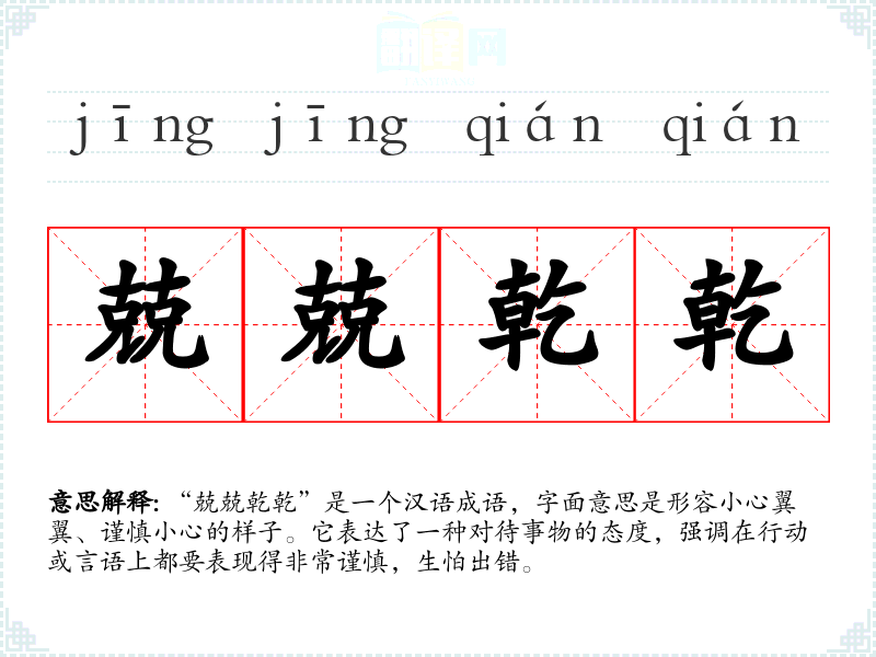 “兢兢乾乾”是一个汉语成语,字面意思是形容小心翼翼、谨慎小心的样子。它表达了一种对待事物的态度,强调在行动或言语上都要表现得非常谨慎,生怕出错。