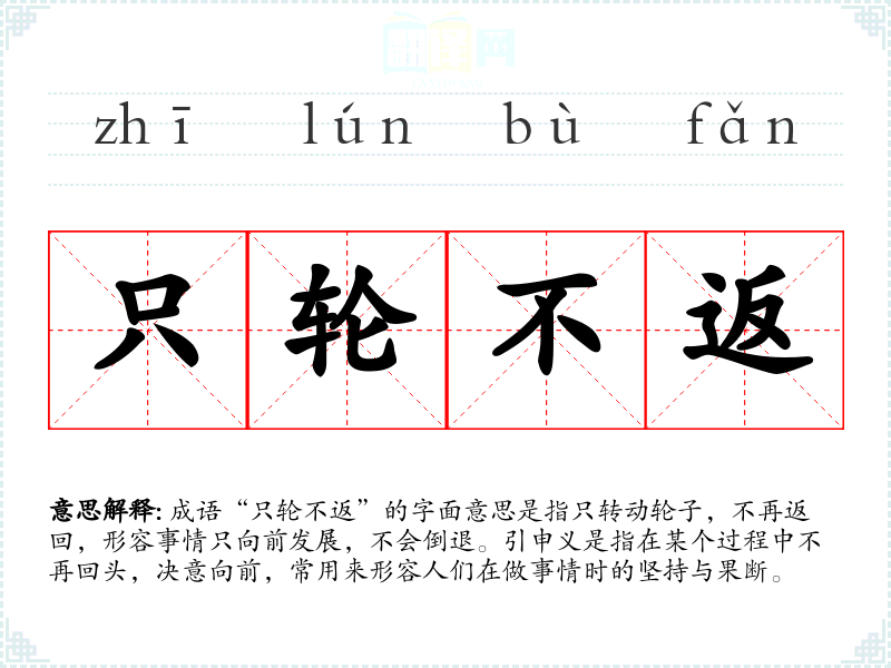 成语“只轮不返”的字面意思是指只转动**,不再返回,形容事情只向前发展,不会倒退。引申义是指在某个过程中不再回头,决意向前,常用来形容人们在做事情时的坚持与果断。
