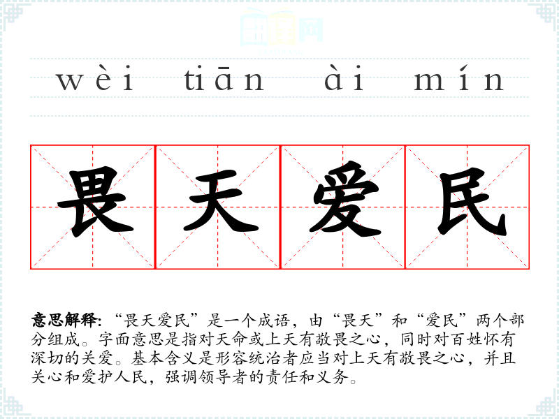 “畏天爱民”是一个成语,由“畏天”和“爱民”两个部分组成。字面意思是指对天命或上天有敬畏之心,同时对百姓怀有深切的关爱。基本含义是形容统治者应当对上天有敬畏之心,并且关心和爱护人民,强调领导者的责任和义务。