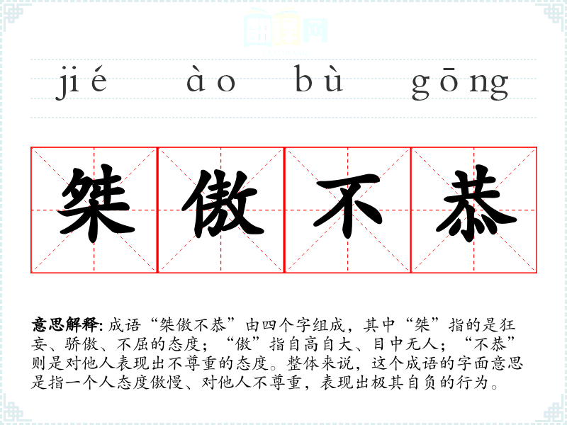 成语“桀傲不恭”由四个字组成,其中“桀”指的是狂妄、骄傲、不屈的态度;“傲”指自高自大、目中无人;“不恭”则是对他人表现出不尊重的态度。整体来说,这个成语的字面意思是指一个人态度傲慢、对他人不尊重,表现出极其自负的行为。
