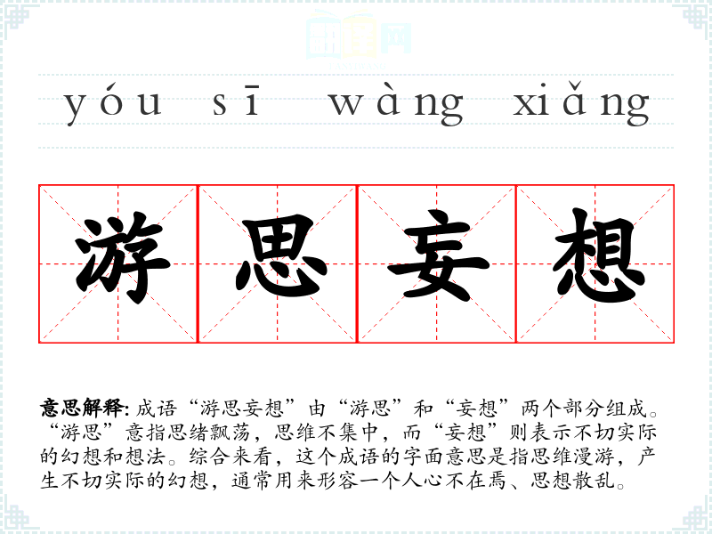 - 反义成语:专心致志、全神贯注。与游思妄想相对,强调集中注意力的状态。