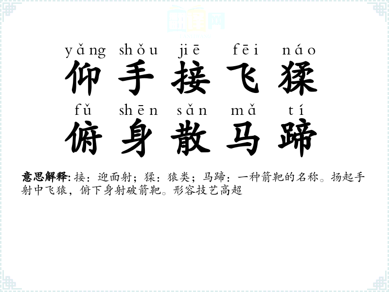接:迎面射;猱:猿类;马蹄:一种箭靶的名称。扬起手射中飞猿,俯下身射破箭靶。形容技艺高超 |