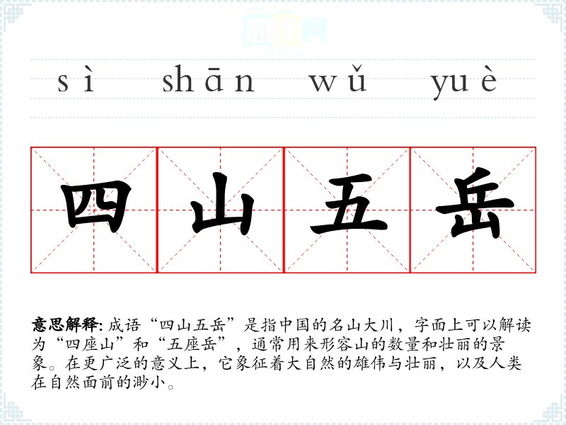 成语“四山五岳”是指**的名山大川,字面上可以解读为“四座山”和“五座岳”,通常用来形容山的数量和壮丽的景象。在更广泛的意义上,它象征着大自然的雄伟与壮丽,以及人类在自然面前的渺小。