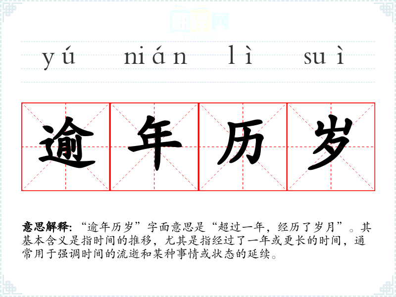 “逾年历岁”字面意思是“超过一年,经历了岁月”。其基本含义是指时间的推移,尤其是指经过了一年或更长的时间,通常用于强调时间的流逝和某种事情或状态的延续。