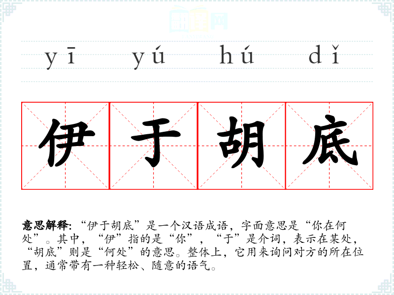 “伊于胡底”是一个汉语成语,字面意思是“你在何处”。其中,“伊”指的是“你”,“于”是介词,表示在某处,“胡底”则是“何处”的意思。整体上,它用来询问对方的所在位置,通常带有一种轻松、随意的语气。