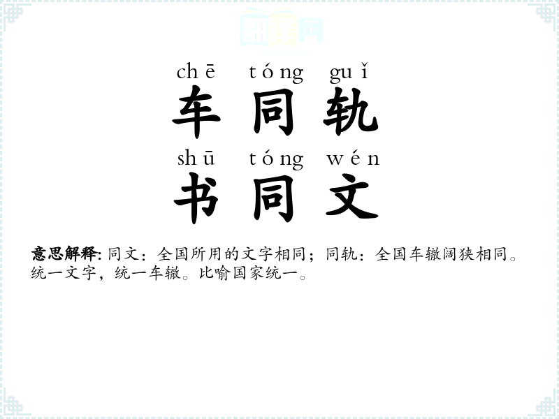 同文:全国所用的文字相同;同轨:全国车辙阔狭相同。统一文字,统一车辙。比喻国家统一。