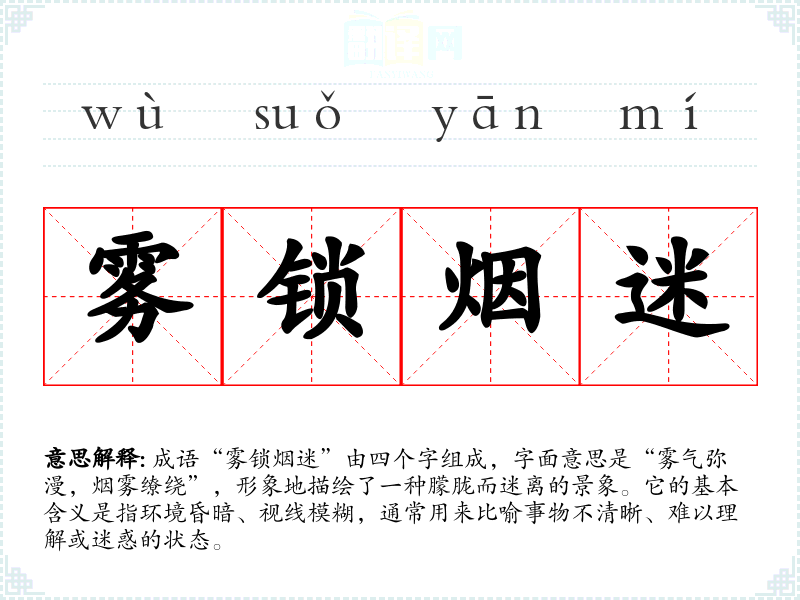 成语“雾锁烟迷”由四个字组成,字面意思是“雾气弥漫,烟雾缭绕”,形象地描绘了一种朦胧而迷离的景象。它的基本含义是指环境昏暗、视线模糊,通常用来比喻事物不清晰、难以理解或迷惑的状态。