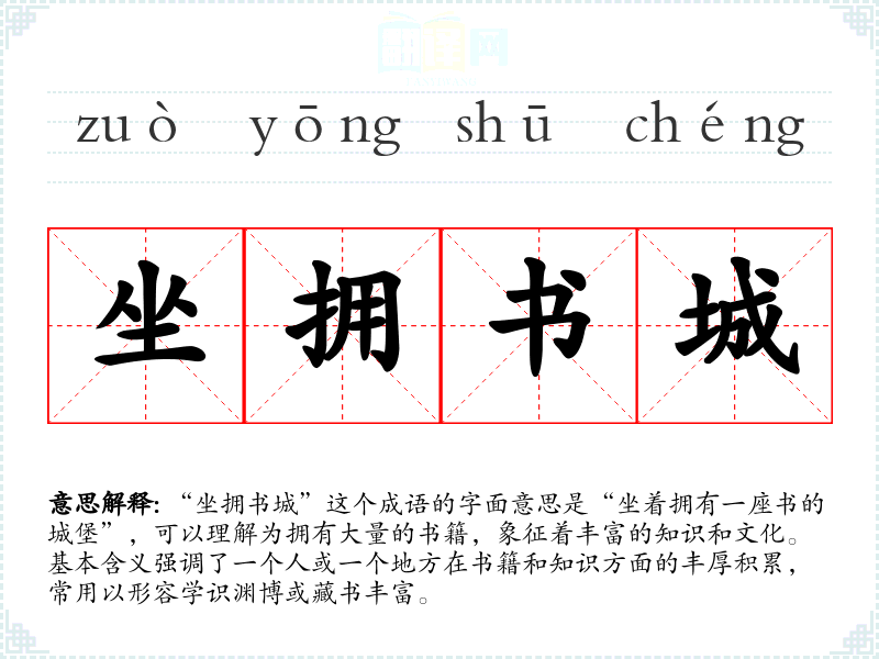 “坐拥书城”这个成语的字面意思是“坐着拥有一座书的城堡”,可以理解为拥有大量的书籍,象征着丰富的知识和文化。基本含义强调了一个人或一个地方在书籍和知识方面的丰厚积累,常用以形容学识渊博或藏书丰富。