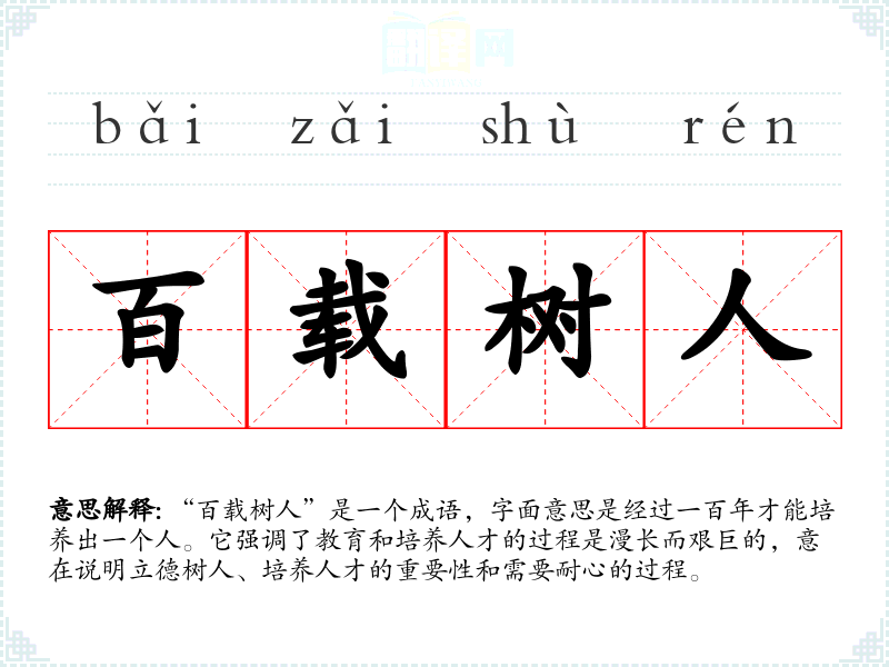 “百载树人”是一个成语,字面意思是经过一百年才能培养出一个人。它强调了教育和培养人才的过程是漫长而艰巨的,意在说明立德树人、培养人才的重要性和需要耐心的过程。