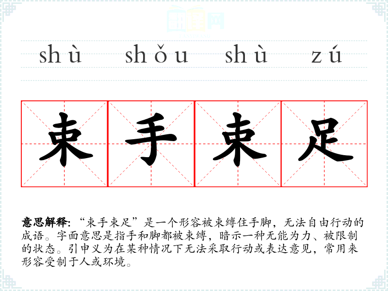“束手束足”是一个形容被束缚住手脚,无法自由行动的成语。字面意思是指手和脚都被束缚,暗示一种无能为力、被限制的状态。引申义为在某种情况下无法采取行动或表达意见,常用来形容受制于人或环境。