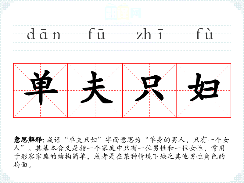 成语“单夫只妇”字面意思为“单身的男人,只有一个女人”。其基本含义是指一个家庭中只有一位男性和一位女性,常用于形容家庭的结构简单,或者是在某种情境下缺乏其他男性角色的局面。