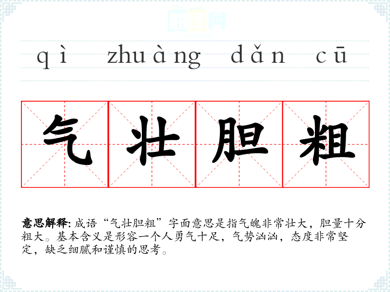 “气壮胆粗”并没有特定的历史典故或文学出处,但它是由两个部分组成的:“气壮”表示气势雄壮,表示一个人的气魄和勇气;“胆粗”则强调胆量大,通常指人不怕困难或危险。这个成语可能是在描述某种人物性格时,自然而然地形成的。