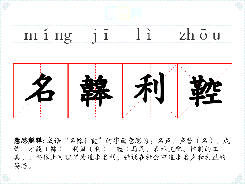 成语“名韟利鞚”的字面意思为:名声、声誉(名)、成就、才能(韟)、利益(利)、鞚(马具,表示支配、控制的工具)。整体上可理解为追求名利,强调在社会中追求名声和利益的姿态。
