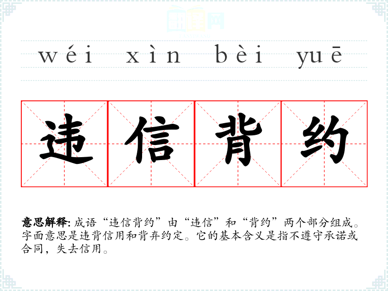 成语“违信背约”由“违信”和“背约”两个部分组成。字面意思是违背信用和背弃约定。它的基本含义是指不遵守承诺或合同,失去信用。