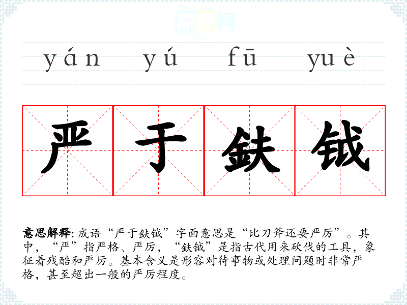成语“严于鈇钺”字面意思是“比刀斧还要严厉”。其中,“严”指严格、严厉,“鈇钺”是指古代用来砍伐的工具,象征着残酷和严厉。基本含义是形容对待事物或处理问题时非常严格,甚至超出一般的严厉程度。