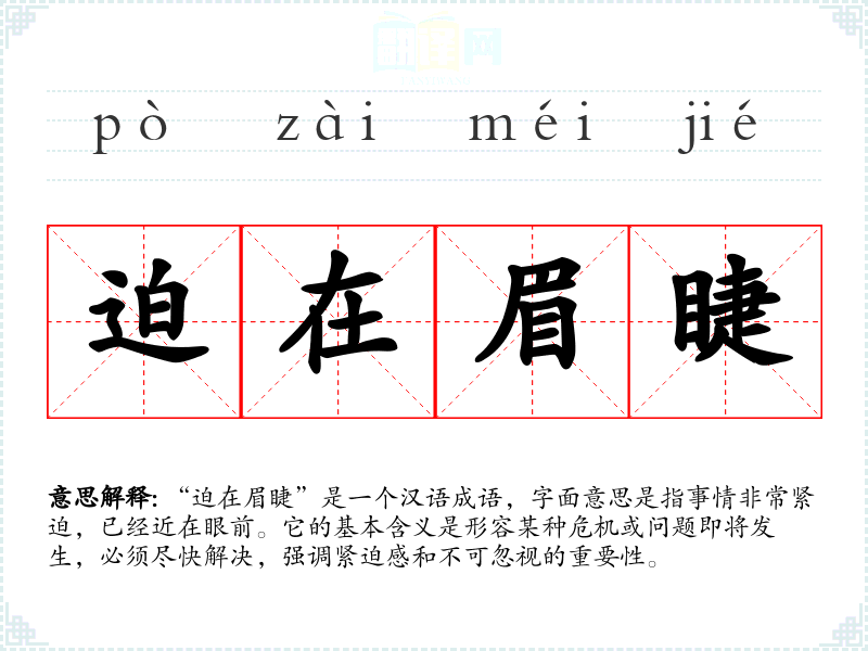 “迫在眉睫”是一个汉语成语,字面意思是指事情非常紧迫,已经近在眼前。它的基本含义是形容某种危机或问题即将发生,必须尽快解决,强调紧迫感和不可忽视的重要性。
