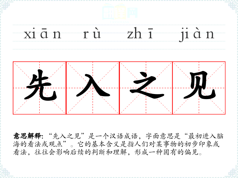“先入之见”是一个汉语成语,字面意思是“最初进入脑海的看法或观点”。它的基本含义是指人们对某事物的初步印象或看法,往往会影响后续的判断和理解,形成一种固有的偏见。