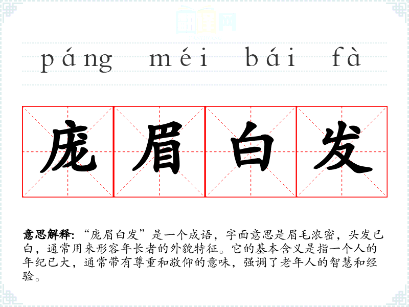 “庞眉白发”是一个成语,字面意思是眉毛浓密,头发已白,通常用来形容年**的外貌特征。它的基本含义是指一个人的年纪已大,通常带有尊重和敬仰的意味,强调了老年人的智慧和经验。